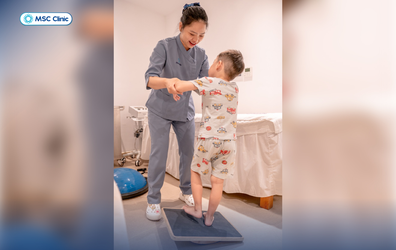 Bé Ỉn 4 tuổi đang thực hiện các bài tập chỉnh bàn chân bẹt dưới sự hướng dẫn của kỹ thuật viên chuyên sâu tại MSC Clinic