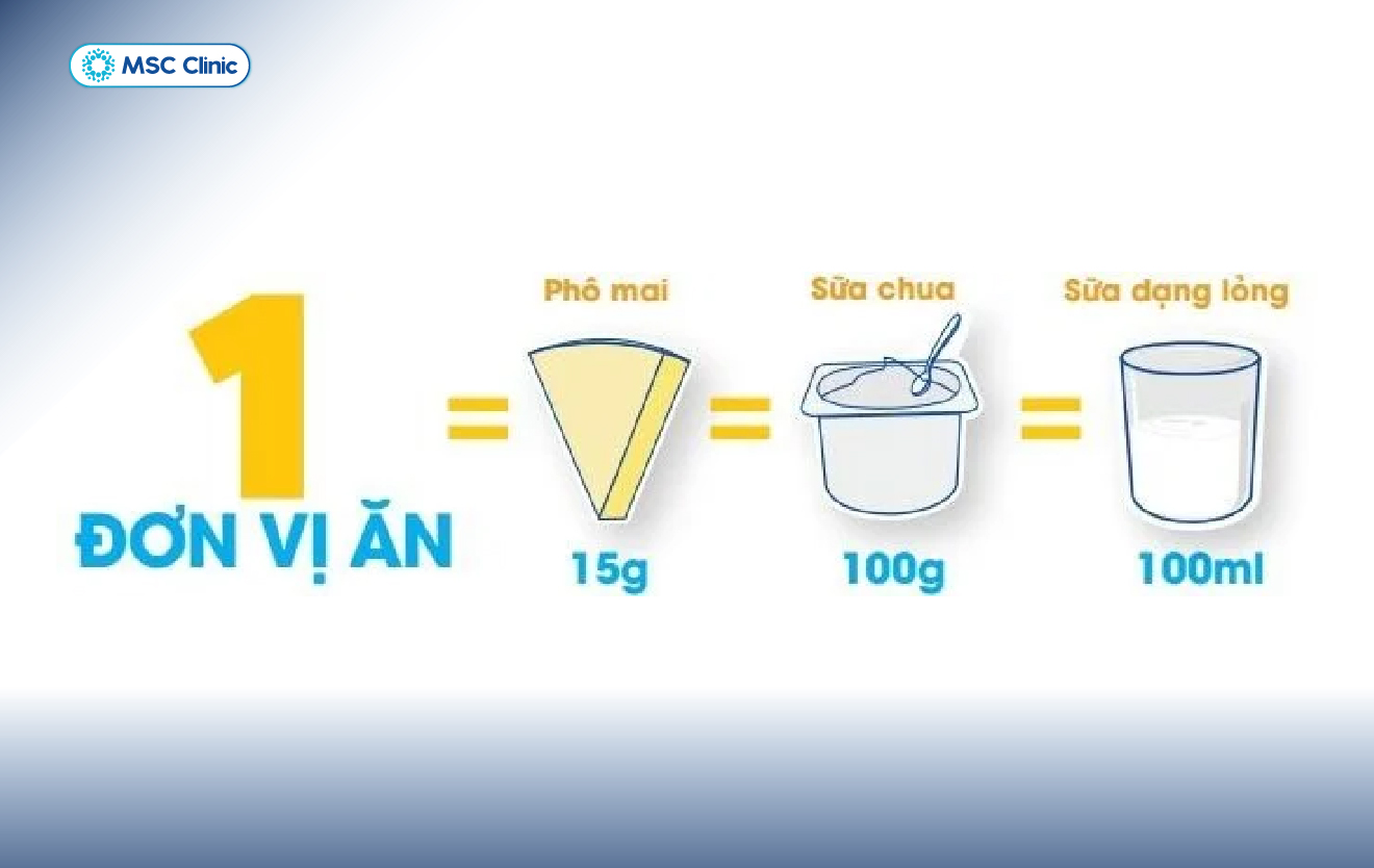 Khẩu phần sữa/chế phẩm từ sữa cho bệnh nhân đái tháo đường tương đương 1 đơn vị ăn sữa
