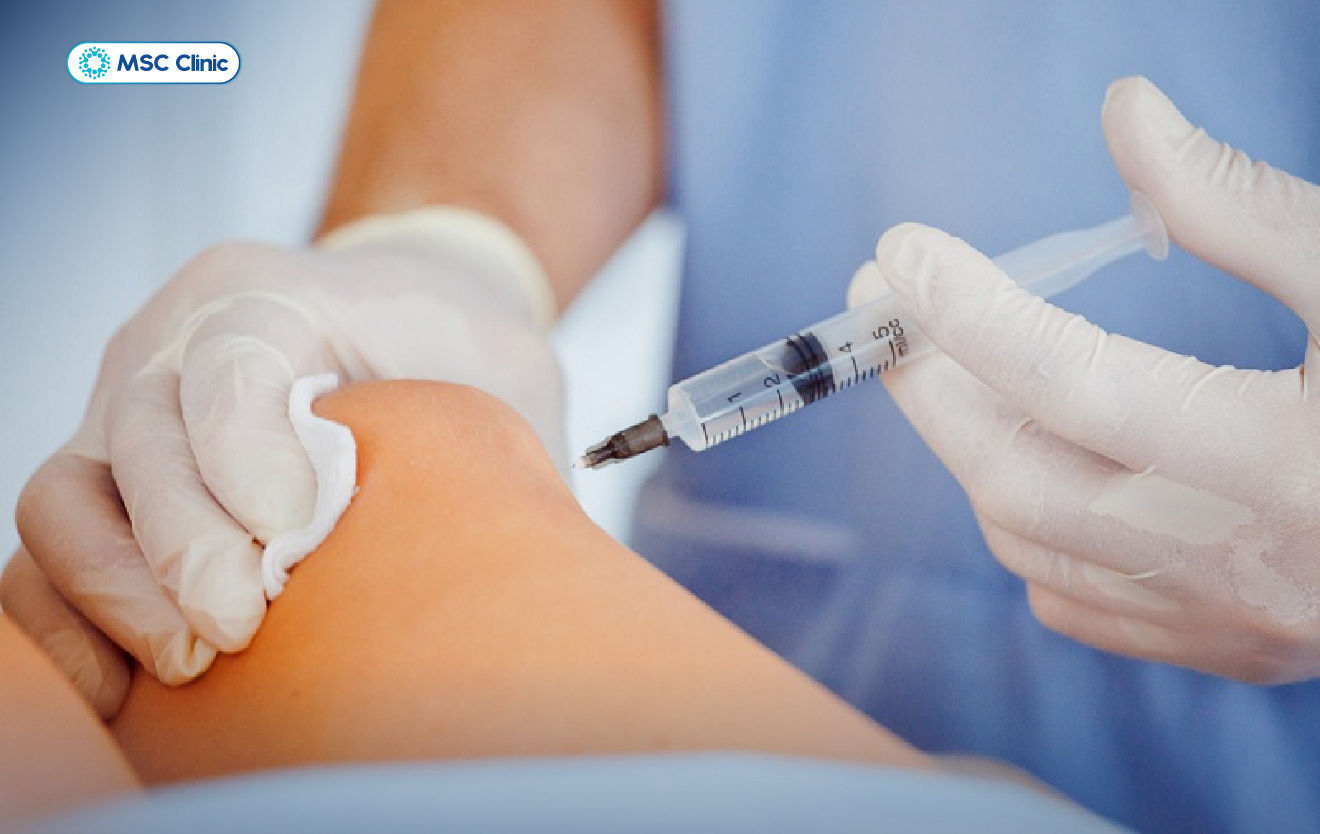 Bác sĩ chuyên khoa cơ xương khớp chuẩn bị tiêm huyết tương giàu tiểu cầu (PRP) cho khách hàng