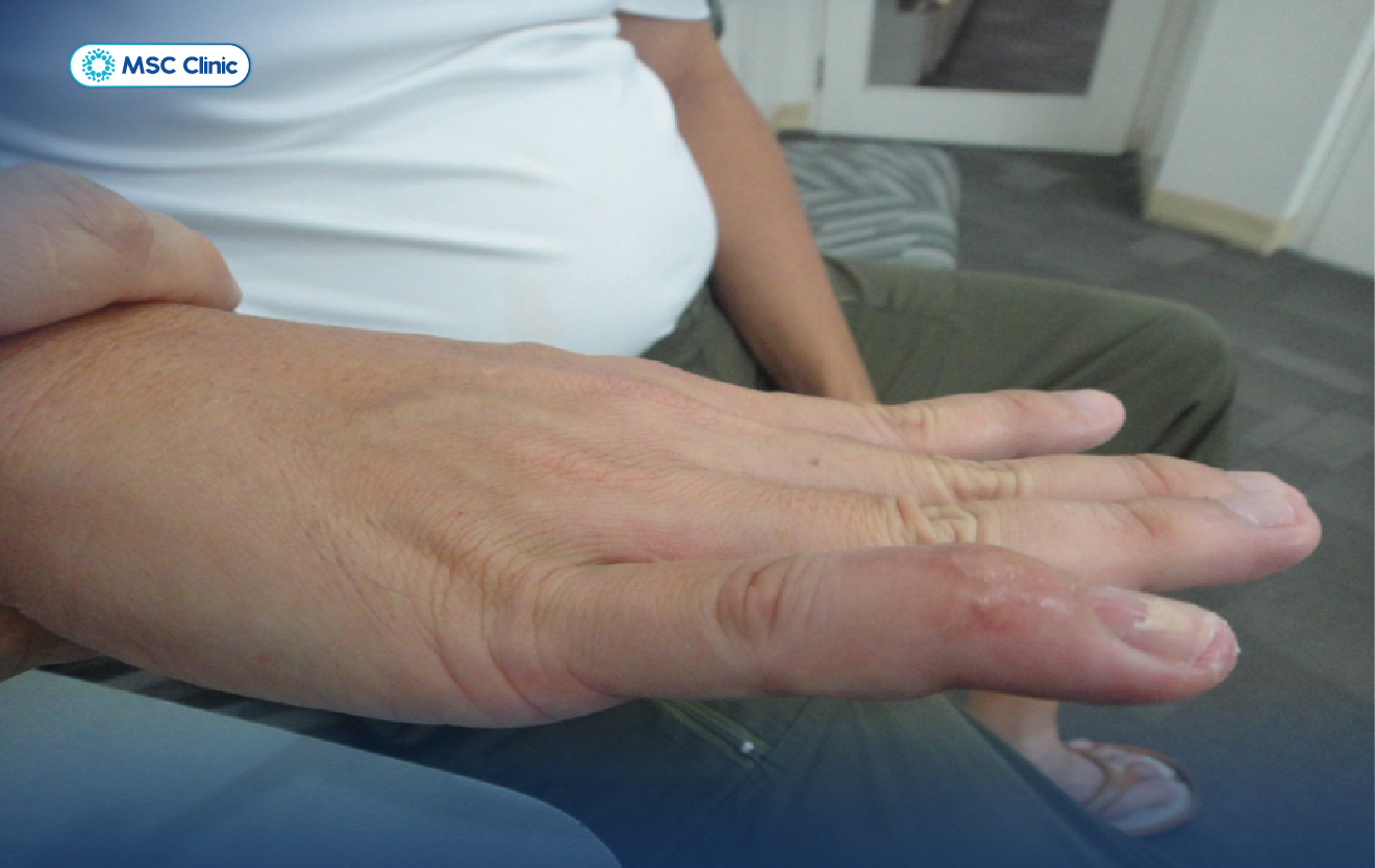 Trường hợp Chị Đỗ Thị Mến – Giảm sưng ngón tay nhanh chóng sau 2 ngày điều trị bằng PRP. Chị Mến đến MSC Clinic trong tình trạng ngón tay sưng to gấp đôi, không thể duỗi thẳng, dù trước đó đã dùng thuốc nhưng không cải thiện. Được BSCKII Trần Trọng Thắng thăm khám, chị được chẩn đoán rách bao khớp liên đốt gần ngón 5 tay phải, một chấn thương cần can thiệp sớm. Chị được chỉ định tiêm PRP, và chỉ sau 2 ngày, vùng viêm sưng đã giảm rõ rệt, cảm giác đau và cứng ngón tay cải thiện đáng kể.