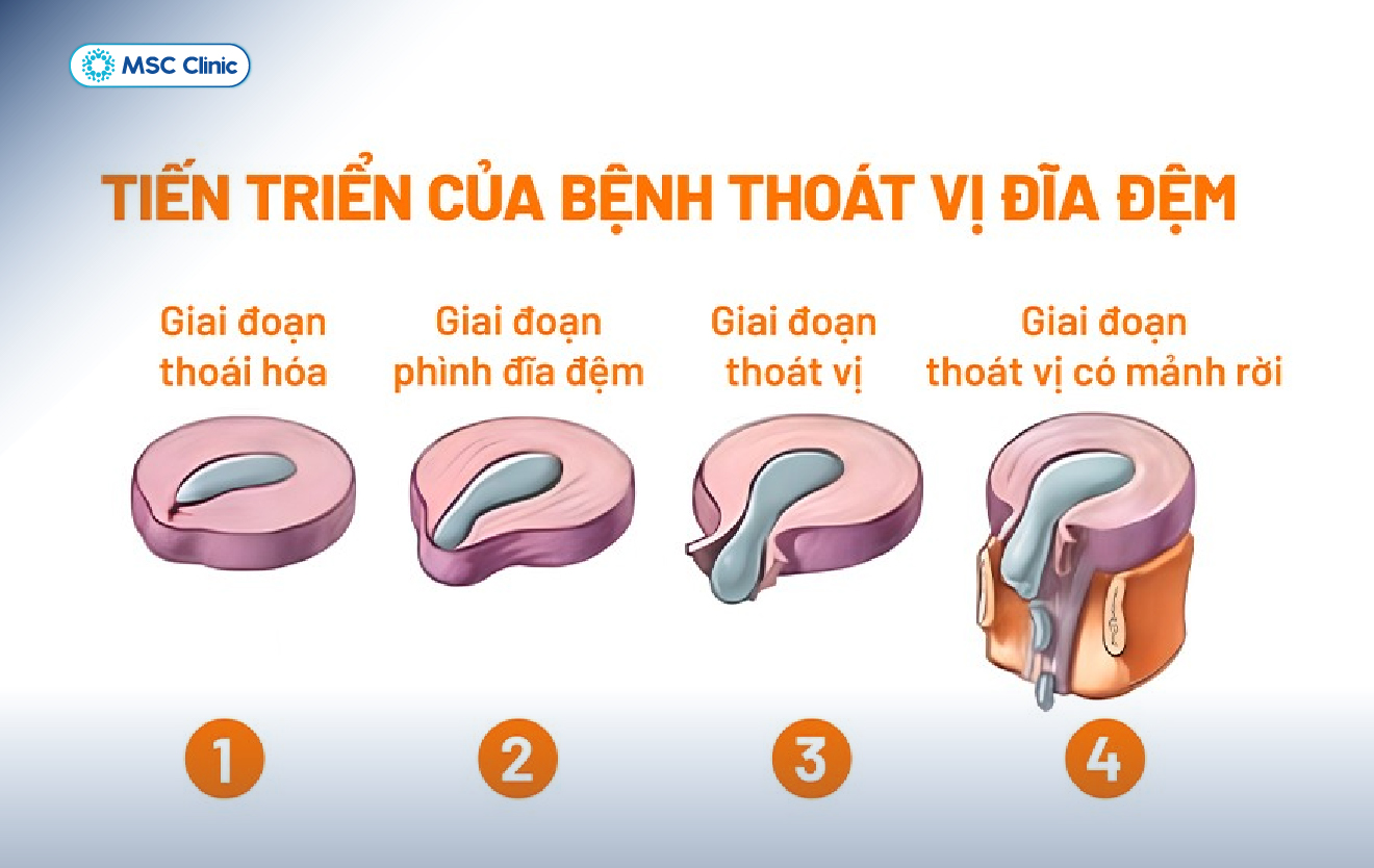 Thoát vị đĩa đệm là tình trạng nhân nhầy bên trong đĩa đệm cột sống bị đẩy lệch hoặc thoát ra ngoài qua một vết nứt hoặc rách ở vòng bao xơ bên ngoài. Khi tình trạng này xảy ra, nhân nhầy thoát ra có thể chèn ép vào các rễ thần kinh hoặc tủy sống gần đó, gây ra các triệu chứng đau nhức, tê bì. Các giai đoạn của thoát vị đĩa đệm bao gồm:
