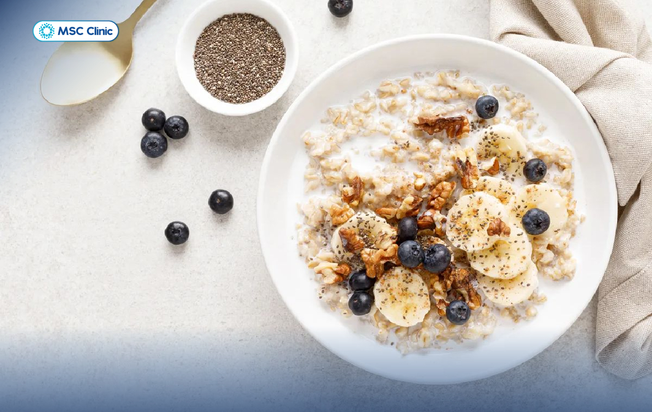Một bát yến mạch nấu cùng sữa không đường, rắc thêm hạt chia và vài quả mọng sẽ là bữa sáng lý tưởng. Yến mạch giàu chất xơ hòa tan giúp làm chậm hấp thu đường, hạt chia bổ sung chất béo lành mạnh, trong khi quả mọng lại có vị ngọt tự nhiên nhưng lượng đường thấp.