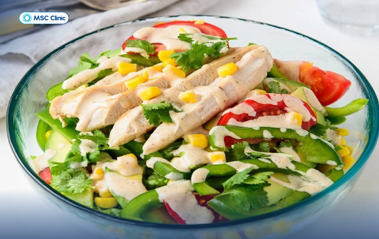 Lựa chọn 3: Salad gà xé + rau xanh + dưa chuột + cà chua + sốt dầu giấm