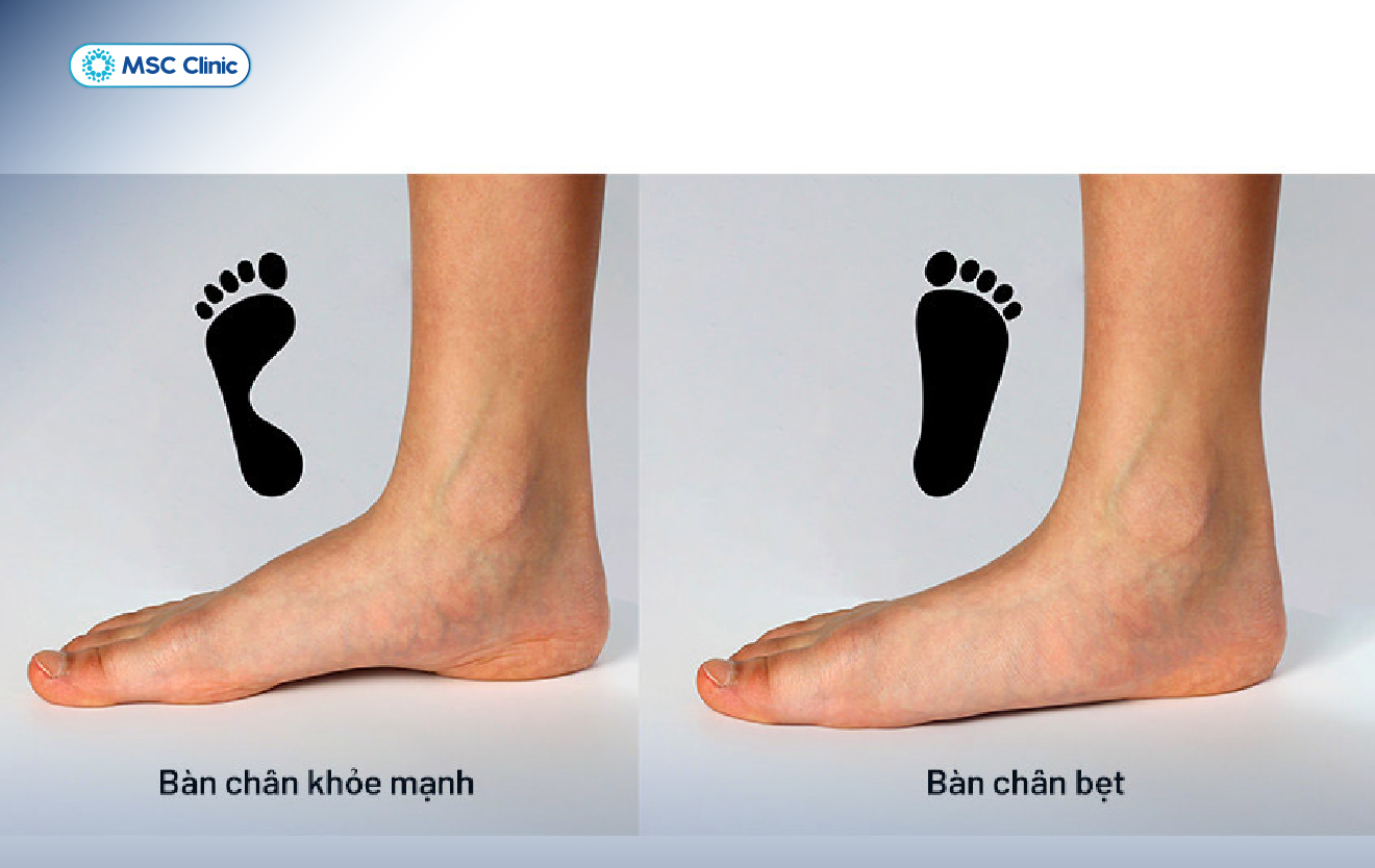 Bàn chân bẹt khiến lòng bàn chân phẳng, mất đi hõm cong tự nhiên. Điều này không chỉ ảnh hưởng đến dáng đi mà còn làm thay đổi cấu trúc ngón chân cái, đẩy ngón cái lệch về phía ngón bên cạnh. Hậu quả là dễ phát sinh viêm bao hoạt dịch, gai gót chân hoặc viêm cân gan chân nếu không được can thiệp sớm.